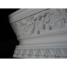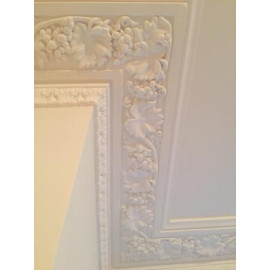 A large decorative cornice with a winding vine set through the ceiling section of this moulding .