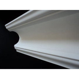 Elegant contoured design projects 120mm on ceiling, 105mm on wall. Detailed lines and deep cove add depth and craftsmanship. Suitable for 8-10ft ceilings. Sold in 2.8m lengths, priced per meter. Handmade from fine plaster. Contours create light/shadow contrast and style. Adhesive sold separately, free install advice.